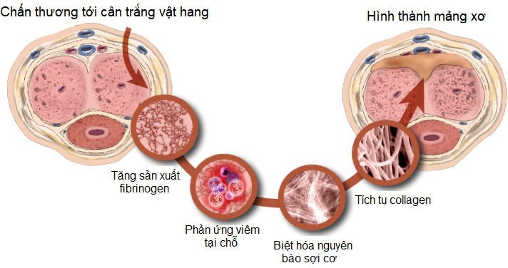 Ngoài ra các lớp sợi của cân trắng được cấu tạo bởi các sợi collagen đan xen với các sợi chun. Sợi collagen có tính chịu lực kéo rất cao nhưng không đàn hồi. Khả năng co giãn của dương vật phụ thuộc chủ yếu vào khả năng đàn hồi của các sợi chun. Khi có chấn thương hoặc vi chấn thương tái diễn tác động vào cân trắng sẽ hoạt hóa phản ứng viêm, biến dạng tổ chức sợi đàn hồi và thoái hóa fibrin. Các tế bào nội mô mao mạch phản ứng bằng việc chuyển hóa fibrinogen thành fibrin dưới tác dụng của thrombin, tạo thành một bộ khung fibrin.