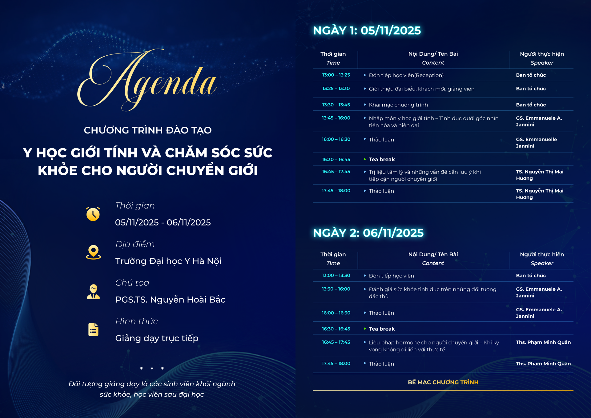 Chương trình gồm hai ngày học, kết hợp giữa bài giảng chuyên sâu và thảo luận học thuật cùng các chuyên gia quốc tế và trong nước, giúp học viên tiếp cận những kiến thức cập nhật và góc nhìn nhân văn trong chăm sóc sức khỏe giới tính.