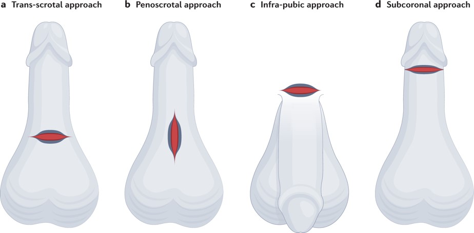 Có 5 đường tiếp cận cơ bản trong phẫu thuật cấy ghép thể hang nhân tạo là đường gốc dương vật – bìu (penoscrotal – PS), dưới xương mu (infrapubic – IP), dưới rãnh quy đầu (subcoronal – SC), trên xương mu (suprapubic), và vùng tầng sinh môn (perineal).
