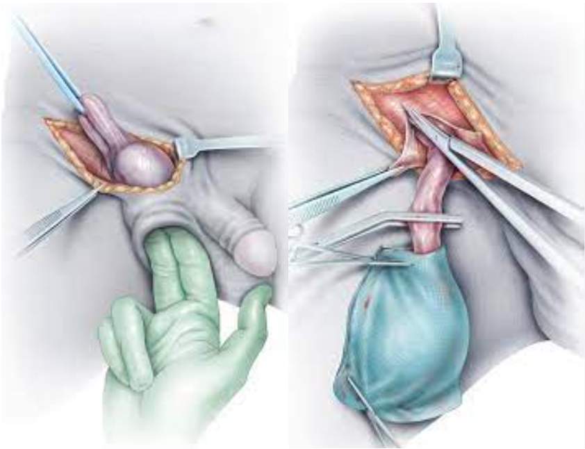 - Tách bó mạch thừng tinh khỏi tổ chức xung quanh, luồn ngón tay trỏ hoặc một dây kéo bó mạch tinh lên trên làm căng dây chằng bìu, sau đó cắt dây chằng bìu