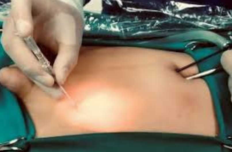 - Rạch da 1mm vị trí 1/3 ngoài nếp bụng mu, tương ứng vị trí lỗ bẹn sâu, dùng kim chọc tủy sống 16G, hướng kim vuông góc với thành bụng chọc xuyên qua thành bụng tới lớp phúc mạc thành bụng, tiến hành luồn kim dưới lớp phúc mạc vòng quanh lỗ bẹn sâu, hướng tới vị trí 3 giờ, từ vị trí này đổi hướng kim về vị trí 7h, lách qua bó mạch tinh và ống dẫn tinh (ở trẻ trai) hoặc dây chằng tròn (ở trẻ nữ), sau đó kim đi vào phúc mạc tại vị trí 7h, rút kim khỏi ổ bụng, giữ lại vỏ kim.