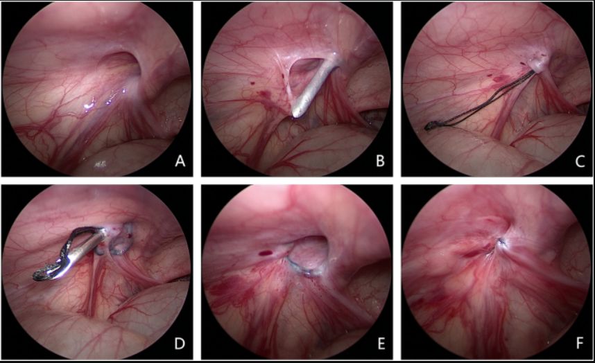 - Tiếp tục xuyên kim ở vị trí ban đầu vào tới lớp phúc mạc và tách lớp phúc mạc của 1/2 vòng còn lại, đâm kim vào ổ bụng vị trí 7h, đúng vị trí chỗ ra của đầu chỉ phía trong. Rút kim khỏi ổ bụng, giữ lại vỏ bọc, luồn rọ Dormia qua vỏ kim 16G vào ổ bụng, mở rọ và dùng pince nội soi gắp đầu chỉ luồn qua thòng lọng của rọ Dormia, đóng rọ kẹp chặt đầu chỉ và kéo đầu chỉ ra ngoài.