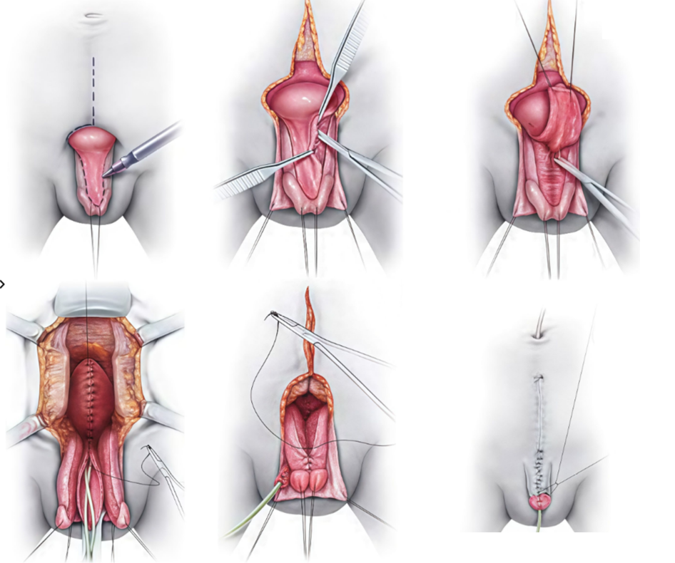 - Bước 6: Tách mở thể hang 2 bên, đưa niệu đạo xuống bụng dương vật, khâu lại thể hang phía trên niệu đạo.