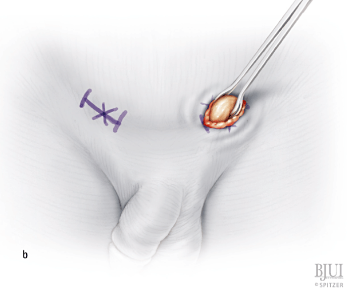 - Rạch da đường bẹn bìu 2-3cm tương ứng vị trí lỗ bẹn nông