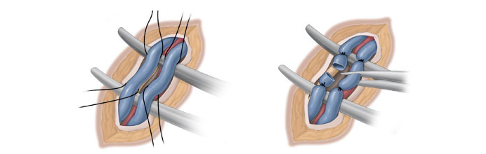 - Phẫu tích bộc lộ bó mạch tĩnh mạch tinh ngoài và các tĩnh mạch dây chằng bìu. Phẫu tích tách riêng rẽ động mạch, tĩnh mạch tinh ngoài, thắt và cắt 2 đầu bó mạch tinh ngoài bằng chỉ PDS hoặc Prolen 5/0, bảo tồn động mạch.