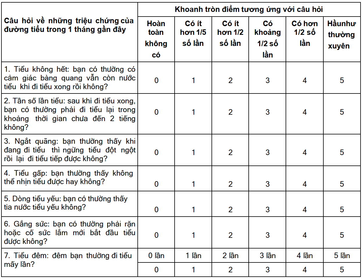 Để định lượng các triệu chứng này năm 2003 AUA (Hội Niệu khoa Mỹ) khuyến cáo sử dụng bảng điểm triệu chứng tuyến tiền liệt quốc tế (IPSS) để đánh giá mức độ nặng của các triệu chứng, đánh giá đáp ứng của bệnh với điều trị và theo dõi tiến triển của bệnh (Bảng 2.3). Bảng điểm IPSS bao gồm 7 câu hỏi liên quan đến 7 triệu chứng chính của đường tiểu dưới. Mỗi câu hỏi được chia 6 mức độ và cho điểm từ 0 (không có triệu chứng) tới 5 điểm (mức độ nặng). Tổng điểm của bộ câu hỏi là 35 điểm, chia thành ba mức: ≤ 7 điểm: triệu chứng mức độ nhẹ; từ 8 - 19 điểm: triệu chứng mức độ vừa; từ 20 - 35 điểm: triệu chứng mức độ nặng.